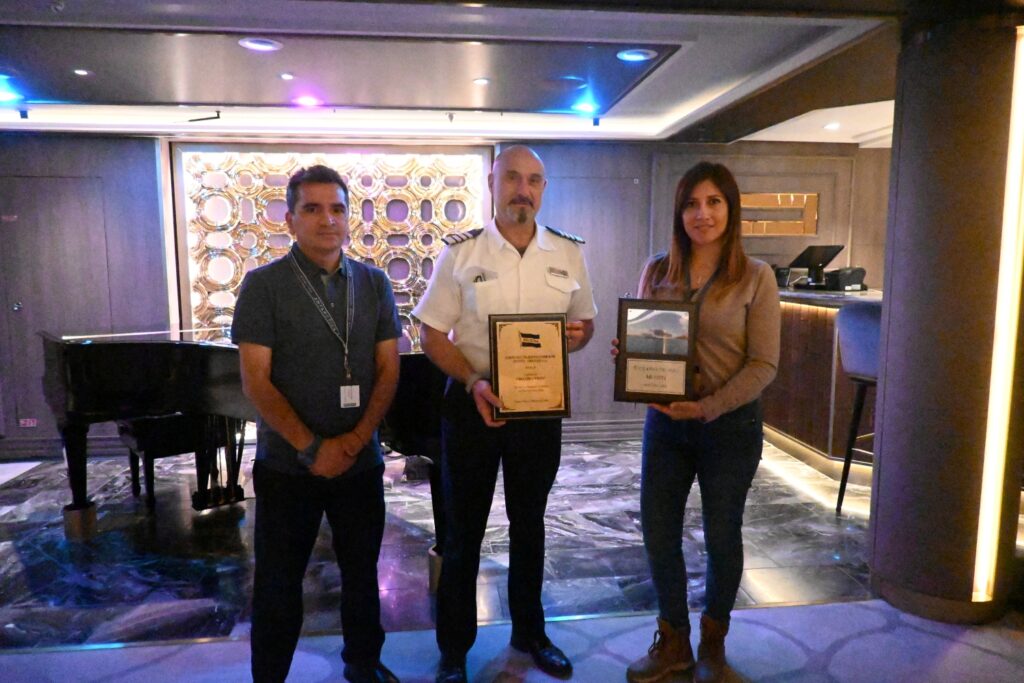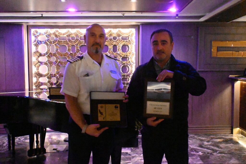 Durante la jornada, representados por nuestro Gerente de Servicios (S), Sergio Díaz, realizamos un intercambio de galvanos con el capitán del crucero Vista, Luca Manzi, en reconocimiento al primer arribo de esta nave a Punta Arenas (mismo acto que realizó la agencia Broom) y como una señal de fortalecimiento de la relación institucional entre el sistema portuario y las navieras internacionales.